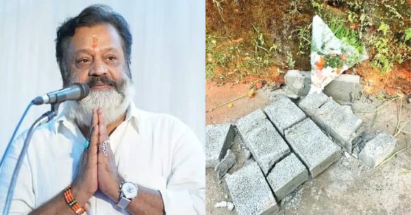 തകര്ത്ത ഫലകത്തിന് മുകളില് പുഷ്പചക്രം വെച്ച നിലയിലായിരുന്നു.