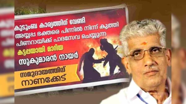 “സുകുമാരൻ നായർ കട്ടപ്പ” എന്നാണ് ബാനറിലെ പരിഹാസം. കുടുംബ കാര്യത്തിനുവേണ്ടി അയ്യപ്പഭക്തരെ പിന്നിൽ നിന്നു കുത്തിയെന്നും സുകുമാരൻ നായർ സമുദായത്തിന് നാണക്കേടാണെന്നും ബാനറിൽ എഴുതിയിരിക്കുന്നത്.