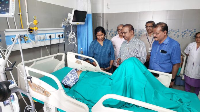 കോട്ടയം : കോട്ടയം മെഡിക്കൽ കോളജിൽ കെട്ടിട ഭാഗം തകർന്നുണ്ടായ അപകടത്തിൽ മരിച്ച തലയോലപ്പറമ്പ് ഉമ്മാക്കുന്ന് മേൽപോത്ത് കുന്നേൽ ഡി. ബിന്ദുവിൻ്റെ മകൾ നവമിയെ തുടർ ചികിത്സയ്ക്കായി മെഡിക്കൽ കോളജ് അത്യാഹിത വിഭാഗത്തിൽ പ്രവേശിപ്പിച്ചു . ജില്ലാ കളക്ടർ ജോൺ വി. സാമുവൽ നവമിയെ സന്ദർശിച്ചു. മെഡിക്കൽ കോളജ് പ്രിൻസിപ്പൽ ഡോ. വർഗീസ് പി. പുന്നൂസ്, സൂപ്രണ്ട് ഡോ. ടി.കെ. ജയകുമാർ, എ.ഡി.എം. എസ്. ശ്രീജിത്ത്, ജില്ലാ ഇൻഫർമേഷൻ ഓഫീസർ എ. അരുൺ കുമാർ എന്നിവർ ഒപ്പമുണ്ടായിരുന്നു. നവമിക്ക് സർക്കാർ എല്ലാ ചികിത്സാ സൗകര്യവും ഉറപ്പാക്കിയിട്ടുണ്ടെന്ന് ജില്ലാ കളക്ടർ പറഞ്ഞു.നവമിയുടെ കഴുത്തിന്റെ ശസ്ത്രക്രിയ കഴിഞ്ഞ് മറ്റൊരു ശസ്ത്രക്രിയക്ക് തയ്യാറെടുക്കുന്നതിനിടെയാണ് കെട്ടിടം ഇടിഞ്ഞു വീണ് ബിന്ദു മരിച്ചത് .