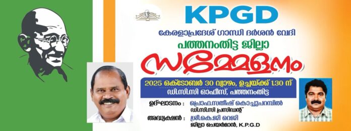 പത്തനംതിട്ട : ഗാന്ധി ദർശൻ വേദി ജില്ലാ സമ്മേളനം 30 വ്യാഴാഴ്ച പത്തനംതിട്ട ഡി.സി.സി.ആഡിറ്റോറിയത്തിൽ നടക്കും.ഡി.സി.സി. പ്രസിഡൻ്റ് പ്രൊഫ.സതീഷ് കൊച്ചു പറമ്പിൽ സമ്മേളനം ഉദ്ഘാടനം ചെയ്യും.തുടർന്ന് ഗാന്ധി ദർശൻ വേദി ഡി.സി.സി.യുടെ മിനി ഹാളിലേക്ക് നൽകുന്ന കസേരകളുടെ സമർപ്പണം നടക്കും.കേരളാ പ്രദേശ് ഗാന്ധി ദർശൻ വേദി ജില്ലാ ചെയർമാൻ കെ.ജി.റെജി അദ്ധ്യക്ഷത വഹിയ്ക്കും.