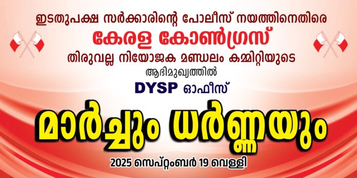 തിരുവല്ല : സംസ്ഥാനത്തെ പോലീസിൻ്റെ കിരാത തേർവാഴ്ചക്കെതിരെയും, മർദ്ദനങ്ങൾക്കെതിരെയും കേരളാ കോൺഗ്രസ് തിരുവല്ല നിയോജക മണ്ഡലം കമ്മറ്റിയുടെ ആഭിമുഖ്യത്തിൽ സെപ്റ്റബർ 19-ന് രാവിലെ 10 മണിക്ക് തിരുവല്ല പോലീസ് സ്റ്റേഷൻ മാർച്ചും, ധർണയും കേരളാ കോൺഗ്രസ് പാർട്ടി സംസ്ഥാന വൈസ് പ്രസിഡന്റ് ജോസഫ് എം പുതുശ്ശേരി ഉദ്ഘാടനം ചെയ്യും. നിയോജകമണ്ഡലം പ്രസിഡൻ്റ് രാജു പുളിംബള്ളി അദ്ധ്യക്ഷത വഹിക്കും.