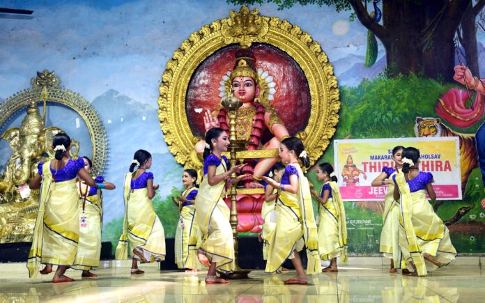ശബരിമല: മകരവിളക്ക് മഹോത്സവത്തിനായി നടതുറന്ന ശബരിമല ശ്രീധർമ്മ ശാസ്താ ക്ഷേത്ര സന്നിധാനത്ത് പുതുവത്സരദിനത്തിൽ ശബരീശന് തിരുവാതിര അർച്ചന സമർപ്പിച്ച് കുഞ്ഞ് മാളികപ്പുറങ്ങൾ. തിരുവനന്തപുരം വെഞ്ഞാറമൂടിലെ ജീവകല സാംസ്‌കാരിക കേന്ദ്രത്തിലെ ഒൻപത് വയസിനു താഴെയുള്ള 11 പെൺകുട്ടികളാണ് സന്നിധാനം നടപന്തലിലെ വേദിയിൽ തിരുവാതിര അവതരിപ്പിച്ചത്.