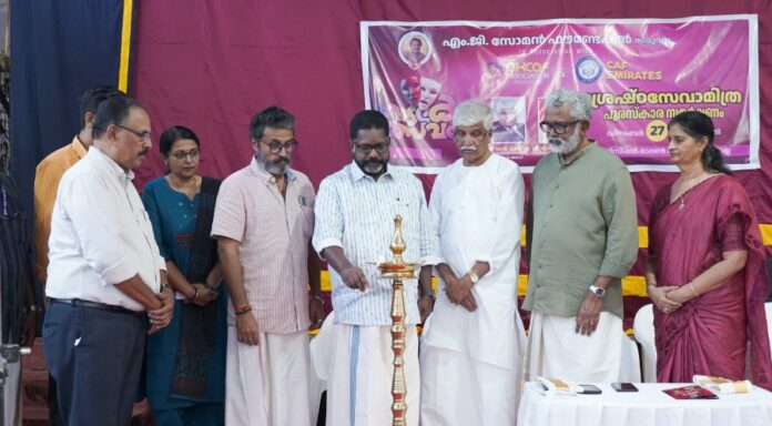 തിരുവല്ല: എം ജി സോമൻ ഫൗണ്ടേഷൻ്റെ മൂന്നാമത് നാടകോൽസവം ഡപ്യൂട്ടി സ്പീക്കർ ചിറ്റയം ഗോപകുമാർ ഉദ്ഘാടനം ചെയ്തു. ചെയർമാൻ ബ്ലസി അദ്ധ്യക്ഷത വഹിച്ച യോഗത്തിൽ  പ്രഥമ ശ്രേഷ്ഠ സേവ മിത്ര അവാർഡ് കെ.ജി. ഏബ്രഹമീന് സമ്മാനിച്ചു.