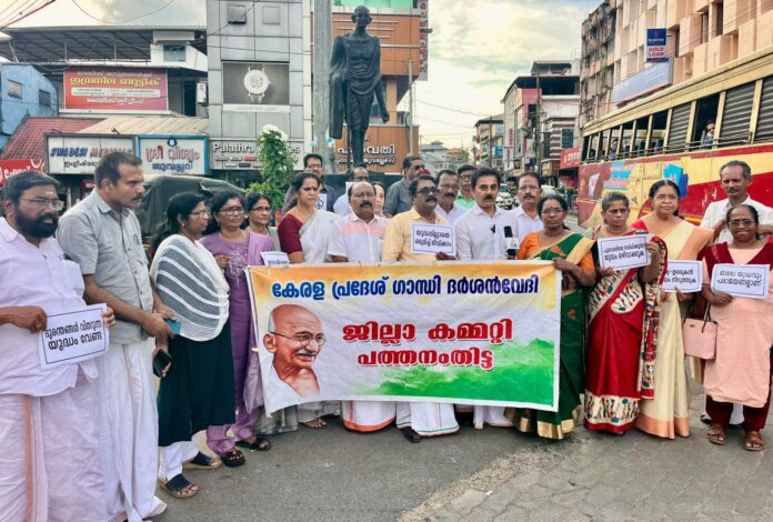 പത്തനംതിട്ട : കേരള പ്രദേശ് ഗാന്ധി ദർശൻ വേദി ജില്ലാ കമ്മിറ്റിയുടെ ആഭിമുഖ്യത്തിൽ ഗാന്ധി സ്ക്വയിൽ യുദ്ധ വിരുദ്ധ കൂട്ടായ്മ നടത്തി. കെ.പി.ജി.ഡി. സംസ്ഥാന ഗവേണിംഗ് ബോഡി മെമ്പർ ഡോ: ഡി.ഗോപീമോഹൻ ഉദ്ഘാടനം ചെയ്തു.