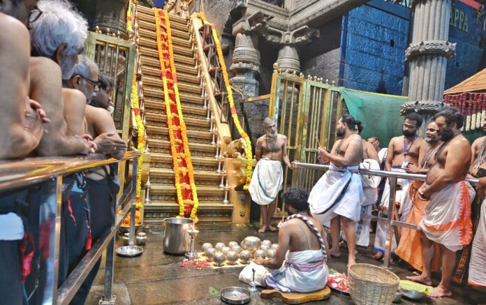 പൂജയുടെ ഭാഗമായി പതിനെട്ടാംപടി കഴുകി വൃത്തിയാക്കി മധ്യഭാഗത്തായി പട്ടുവിരിച്ചു. പട്ടിന്റെ ഇരുവശത്തും വലിയ ഹാരങ്ങള് കൊണ്ട് അലങ്കരിച്ചു. പതിനെട്ടു പടികളില് ഇരുവശത്തും നിലവിളക്ക് തെളിച്ചു. പടികളില് പൂജാദ്രവ്യങ്ങളും വച്ചു. പിന്നീട് ഓരോ പടികളിലും കുടികൊള്ളുന്ന മലദൈവങ്ങള്ക്ക് പൂജ നടത്തി. ഓരോ പടിയിലും ദേവചൈതന്യം ആവാഹിച്ചിട്ടുണ്ടെന്നാണ് വിശ്വാസം. ശബരിമല അടക്കമുള്ള പതിനെട്ട് മലകളെയാണ് പടികള് പ്രതിനിധാനം ചെയ്യുന്നതെന്നാണ് സങ്കല്പം.