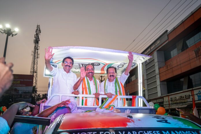 തിരുവല്ല:തിരുവല്ലയിലെ യുഡിഎഫ് സ്ഥാനാർത്ഥി അഡ്വ. വർഗീസ് മാമ്മന്റെ തിരഞ്ഞെടുപ്പ് പ്രചരണാർത്ഥം കോൺഗ്രസ് നേതാവ് രമേശ് ചെന്നിത്തലയുടെ റോഡ് ഷോ നടന്നു .തിരുവല്ലയിലെ യുഡിഎഫ് സ്ഥാനാർത്ഥി അഡ്വ. വർഗീസ് മാമ്മനോടും ആൻ്റോ ആൻ്റണിയോടുമൊപ്പം പൊടിയാടിയിൽ നിന്നും തുടങ്ങിയ റോഡ് ഷോ കാവുംഭാഗം, തിരുവല്ല ടൗൺ വഴി മഞ്ഞാടിയിൽ സമാപിച്ചു.