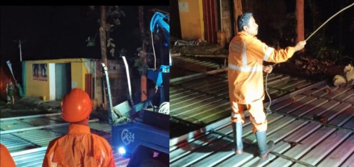 വെമ്പള്ളി രത്നഗിരി പള്ളിക്ക് സമീപം റേഷൻ കട പടിയിൽ ഇന്ന് വൈകിട്ട് 7 മണിയോടെ ഉണ്ടായ കനത്ത കാറ്റിലും മഴയിലും സമീപത്തെ കെട്ടിടത്തിന്റെ മേൽക്കൂര റോഡിലേക്ക് പതിച്ചത്. മാസങ്ങളോളമായി അടച്ചിട്ടിരുന്ന അന്നപൂർണേശ്വരി എന്ന ഹോട്ടലിന്റെ മേൽക്കൂരയാണ് പൂർണ്ണമായും ഇളകി റോഡിൽ വീണത്.