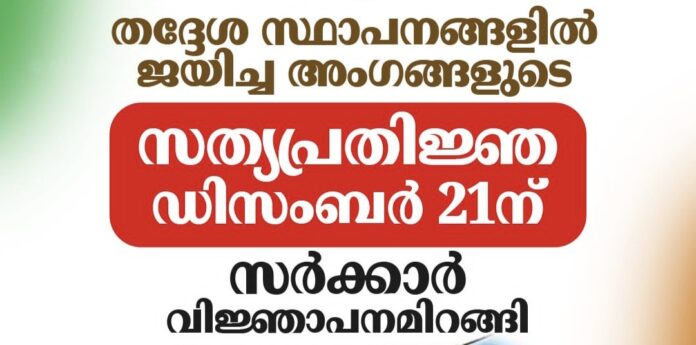 ഗ്രാമ പഞ്ചായത്ത്, ബ്ലോക്ക് പഞ്ചായത്ത്, ജില്ലാ പഞ്ചായത്ത്, മുനിസിപ്പൽ കൗൺസിലുകൾ എന്നിവിടങ്ങളിൽ ഡിസംബർ 21 ന് രാവിലെ 10നും കോർപ്പറേഷനുകളിൽ 11.30 നുമാണ് സത്യപ്രതിജ്ഞ നടപടികൾ ആരംഭിക്കുക.